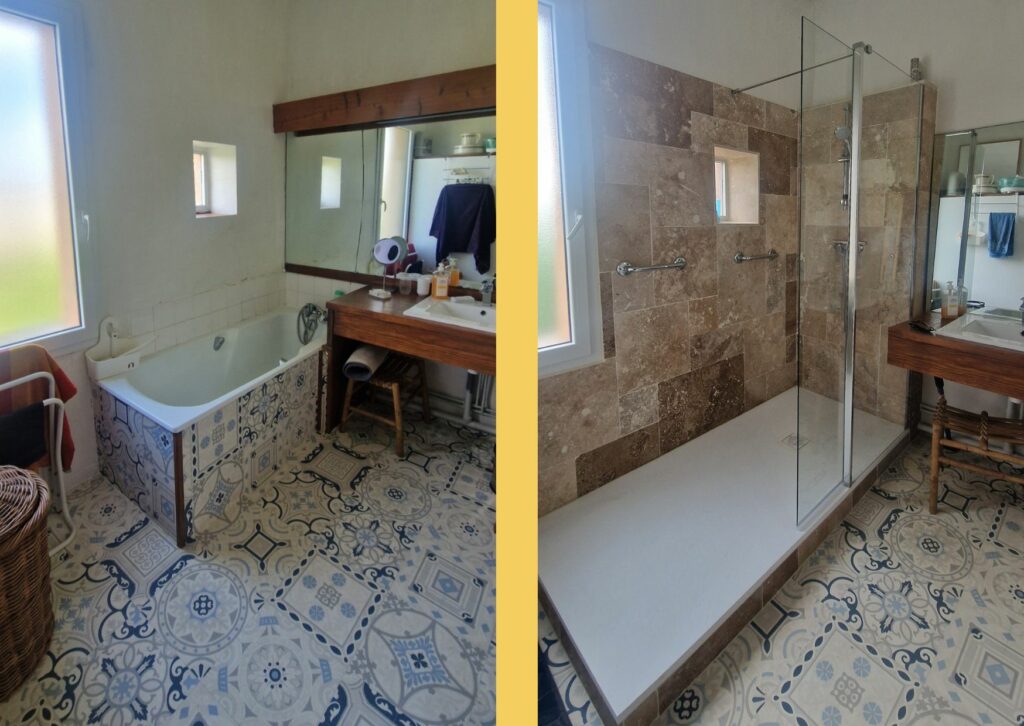 Le défi ? Adapter une pièce d’eau située dans un vieux mas de notre territoire, où les contraintes techniques ne permettaient pas une douche totalement de plain-pied.